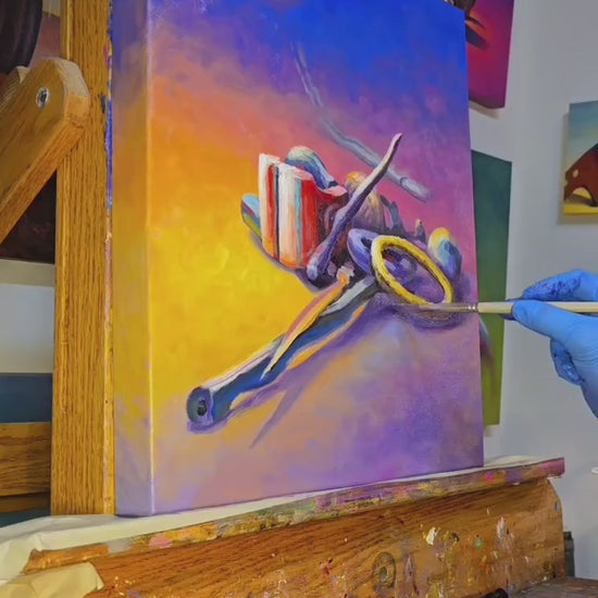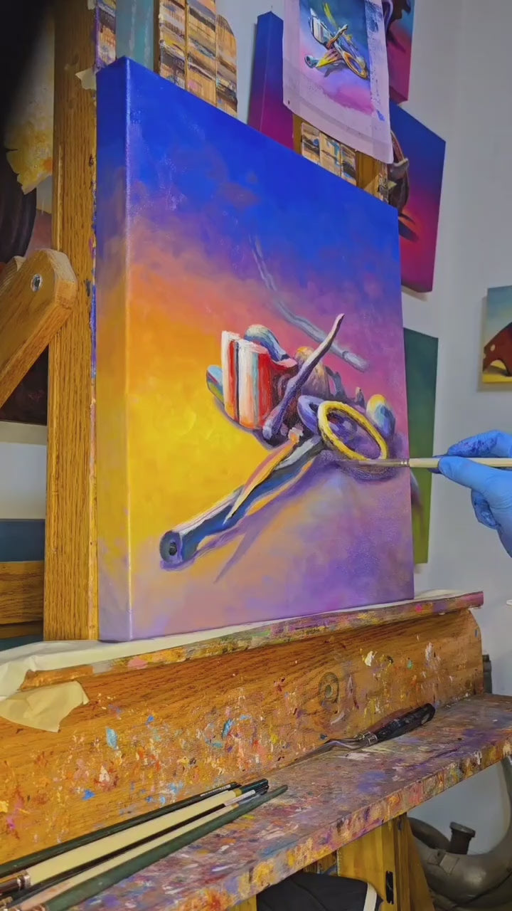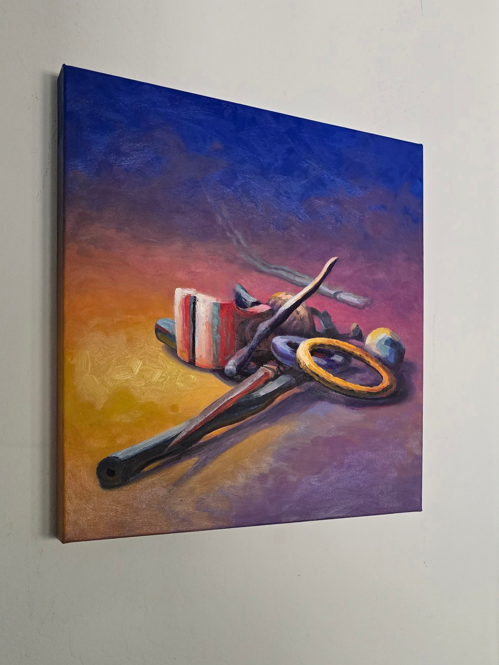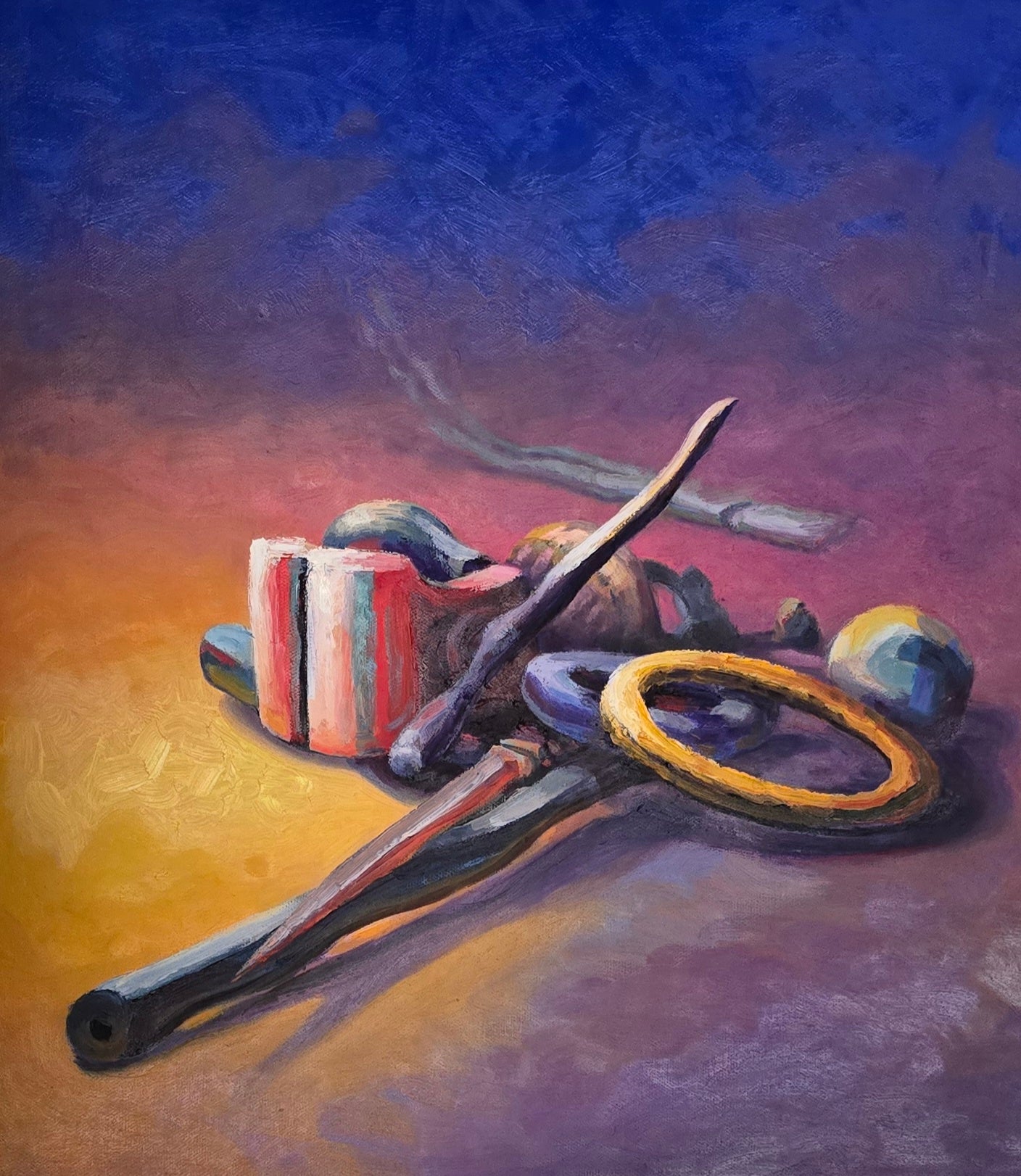 oil on canvas 16"×18" This artwork is a still life painting featuring a collection of objects arranged in a landscape setting. The color palette transitions from warm yellow and orange tones on the left to deep purples and blues on the right, creating a dramatic contrast between light and shadow. Among the objects is an accumulation of long rusty tubes, round cylinders and rings, coiled pipes and hoses, as well as a cylindrical container with red and white stripes. The items cast shadows that stretch toward the cooler, darker side of the painting, enhancing the depth and three-dimensionality of the composition. The lighting emphasizes the textures and shapes of the individual objects, producing vivid and engaging visual effects. The overall mood of the painting combines warmth with a sense of mystery, driven by the interplay of color and form."
